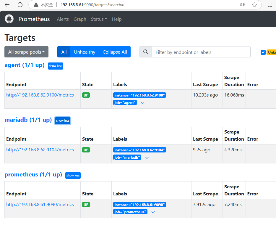 /usr/local/prometheus/prometheus.yml 配置文件末尾增加mariadb项