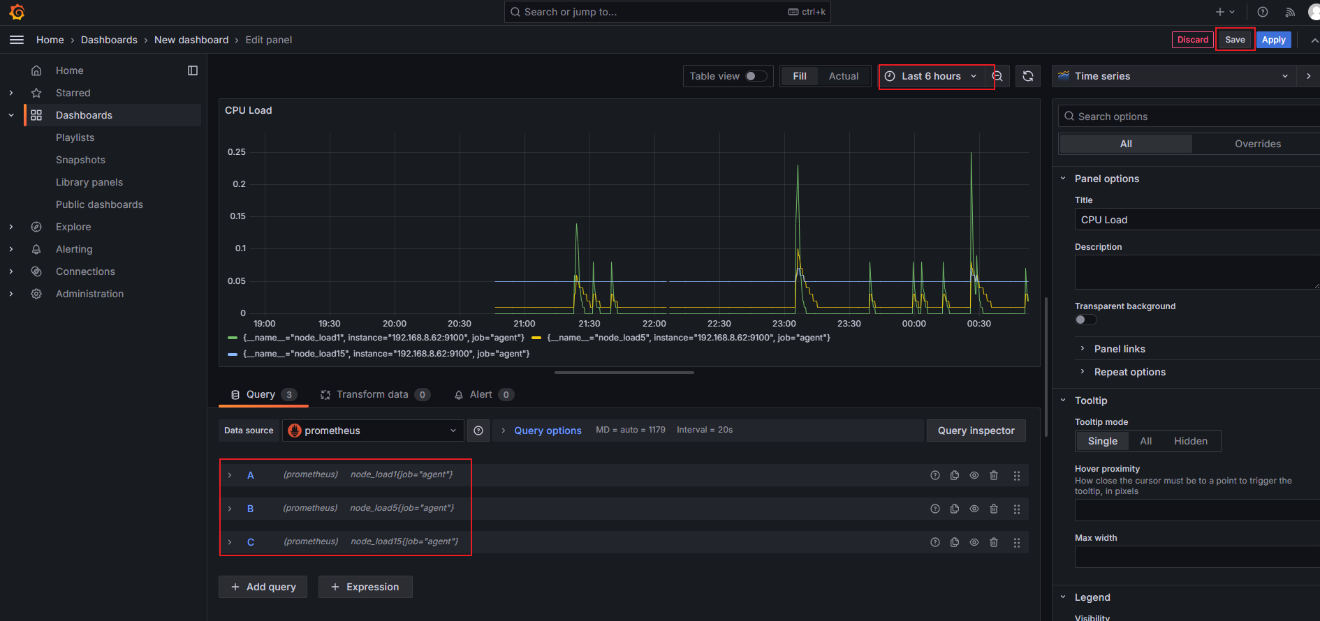 添加add query增加查询内容,这里再添加cpu平均5分钟和15分钟的数据,可自由选择数据的时间区间,最后save保存