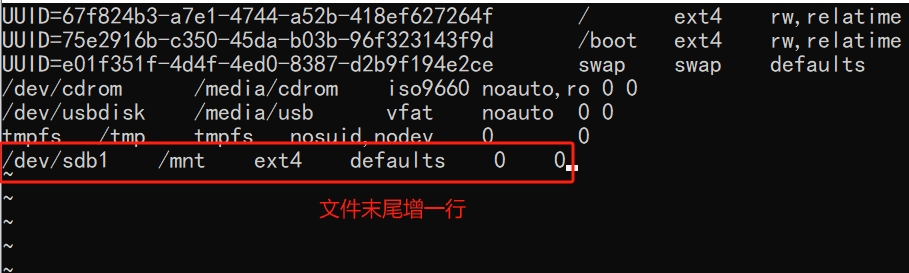 /dev/sdb1 /mnt ext4 defaults 0 0