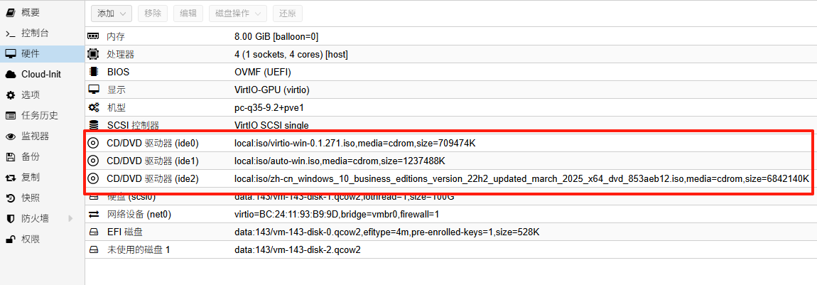 CD/RVD驱动器要添加好3个,分别: vir-win-*.iso: 最新稳定版本VirtIO 驱动程序镜像,下载连接:https://fedorapeople.org/groups/virt/virtio-win/direct-downloads/archive-virtio/